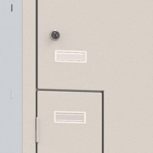 Armadio spogliatoio metallico con ante rinforzate, la chiusura viene effettuata con serratura indipendente. Ogni porta dispone di feritore per aerazione e porta etichette frontale.