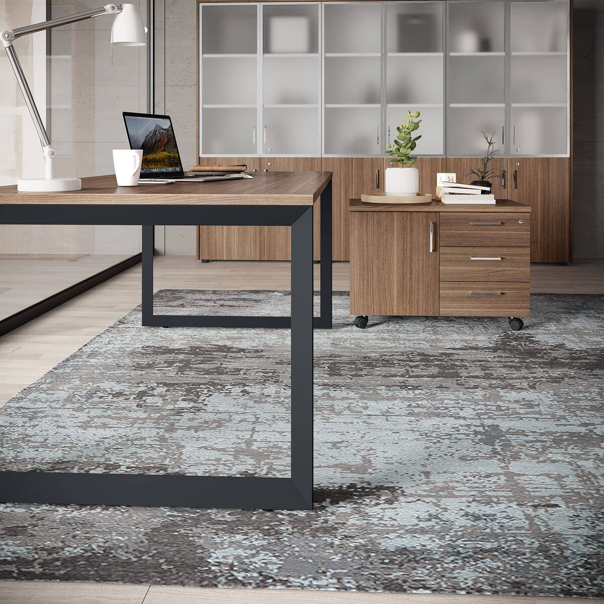 Scrivania direzionale con gamba ad anello colore nero con mobile di servizio su ruote