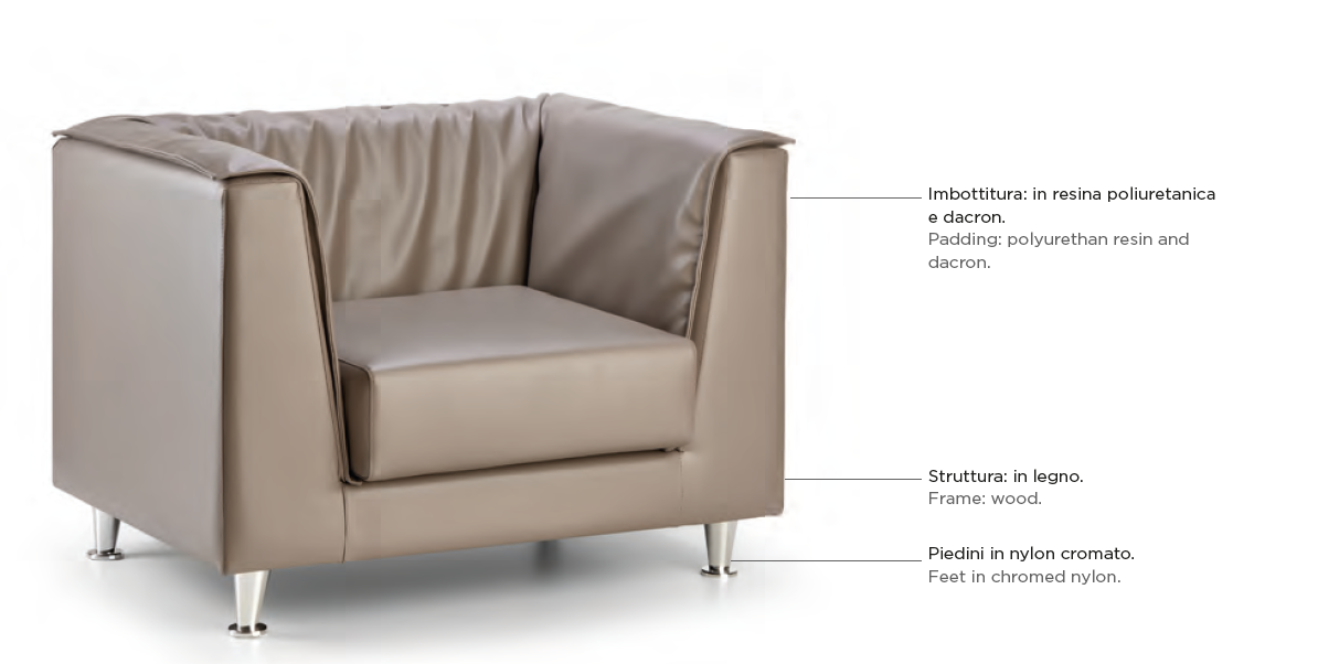 Divano due posti con seduta in ecopelle, struttura in legno e imbottitura in resina poliuretanica.