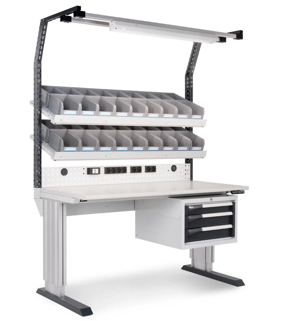 Il banco con gambe regolabili in altezza elettricamente tramite tastierino numerico presenta un armadio a tre cassetti nella parte inferiore, mentre la parte superiore è dotata di un pannello forato Electric con multiprese, prese USB e interruttore magnetotermico, pannelli forati/mensole per l’alloggiamento di contenitori portaminuteria Picking Box e montanti con binari per l’installazione di lampade Iron Team Light.