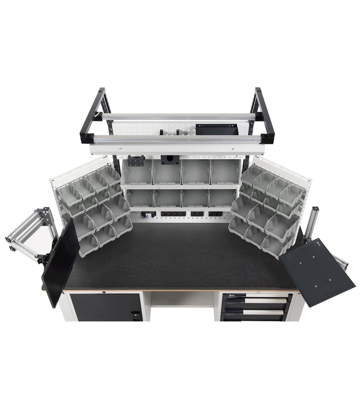 Il banco da lavoro portautensili con cassetti e contenitori è ideale per attività di picking o riparazioni. L’allestimento del Work Master BR è composto da componenti per l’organizzazione di kit o ricambi: pannelli con cerniera per il fissaggio di barre aggancio e mensole inclinate con bordo fermacasse consentono l’installazione di contenitori Picking Box. I due bracci estensibili montati su profilo per piani in legno sostengono la piastra porta monitor e un vassoio inclinato per il supporto di ulteriori materiali e ricambi. L’armadio a porta battente, i semipiani e l’armadio a cassetti sono utili per l’organizzazione di attrezzatura, utensili e componenti di media dimensione.