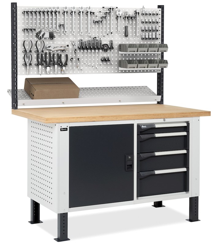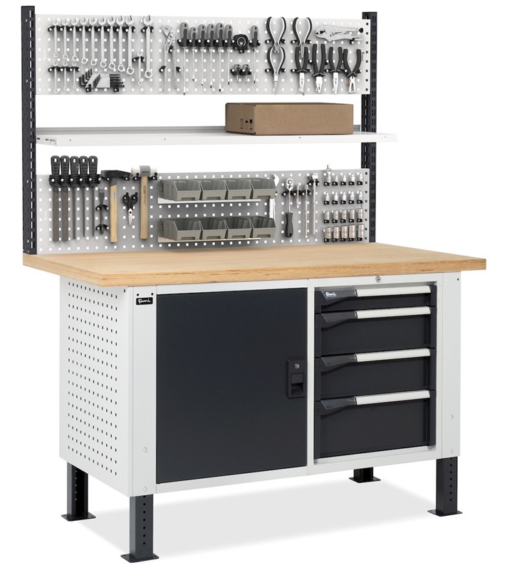 Il banco da lavoro porta attrezzi Work Master BR è dotato di piano in multiplex da 40 mm e gambe regolabili in altezza. Nella parte inferiore è installato un armadio con 4 cassetti, con portata ed estrazione variabile, ed un vano con porta e piano interno. I pannelli forati laterali chiudono i fianchi del banco e consentono il fissaggio di accessori per l’organizzazione di utensili.