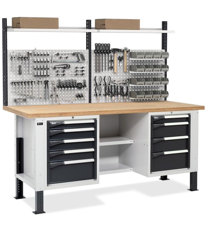 Il banco da lavoro porta attrezzi Work Master BR è dotato di gambe regolabili in altezza ed è allestito con due armadi a 4 e 5 cassetti, con estrazione e portata variabile, e 2 semipiani. Il piano di lavoro è in multiplex con spessore 40 mm e presenta, inoltre, chiusura posteriore e due pannelli forati laterali per il fissaggio di accessori e ganci.