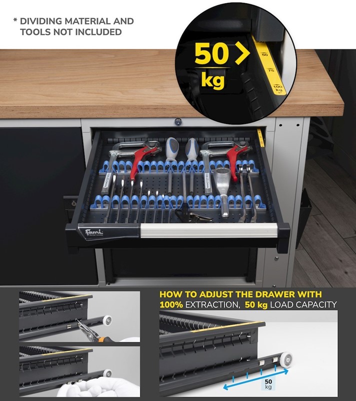Regolabile in altezza, il banco da lavoro porta attrezzi Work Master BR presenta diversi elementi per rendere la postazione di lavoro efficiente e adatta alle molteplici necessità di utilizzo.