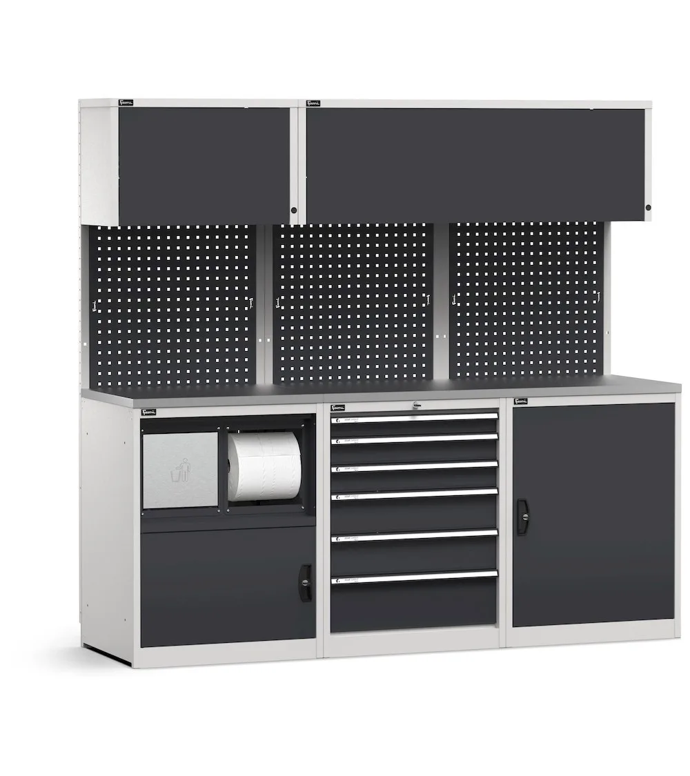 Il sistema modulare di arredo officina Gear Garage è il risultato dell’unione di diversi moduli per facilitare l’organizzazione del materiale di lavoro e favorire l’ottimizzazione e il risparmio di spazio nell’officina. È composto da un armadio ad anta a battente, cassettiera, vano porta rifiuti e porta rotolo di carta, oltre a pareti attrezzate con pensili vasistas. Il piano di lavoro è in acciaio inox satinato e l’intera composizione può essere ampliata nel tempo per adattarsi ai possibili bisogni dell’utilizzatore.