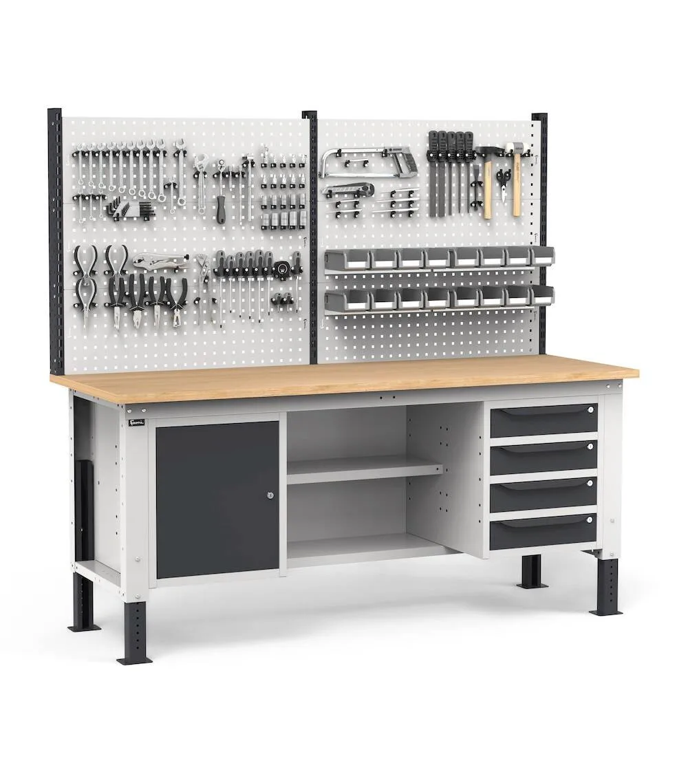Il banco da lavoro regolabile in altezza Work Up è un componente essenziale per il lavoro quotidiano di artigiani e professionisti. Offre agli operatori la possibilità di organizzare attrezzi e minuteria andandoli a stoccare nell’armadio a cassetto o posizionandoli sul pannello forato con ganci o accessori. Il banco ha un’altezza regolabile tra 732 e 1107 mm.