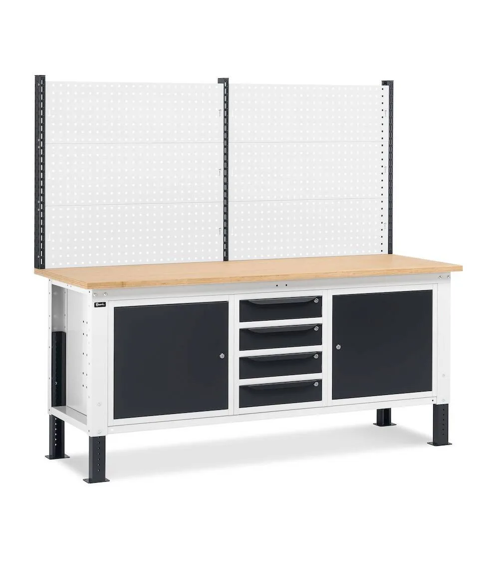 La parte inferiore del banco è dotata di un armadio con 4 cassetti e un vano con anta che offre ulteriore spazio per lo stoccaggio sicuro di utensili e attrezzature. Entrambi gli armadi sono forniti di una serratura a cilindro, garantendo la sicurezza del materiale custodito. Inoltre, il banco è completato da un semipiano che aggiunge ulteriore superficie di appoggio e ottimizza lo spazio disponibile per i lavori più complessi.