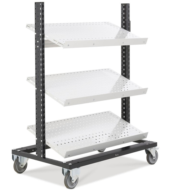 Il carrello per picking magazzino è composto da tre pannelli forati/mensola con bordo fermacasse che possono essere utilizzati in posizione orizzontale o inclinata per poter organizzare una vasta gamma di attrezzatura, materiale di lavoro o contenitori.