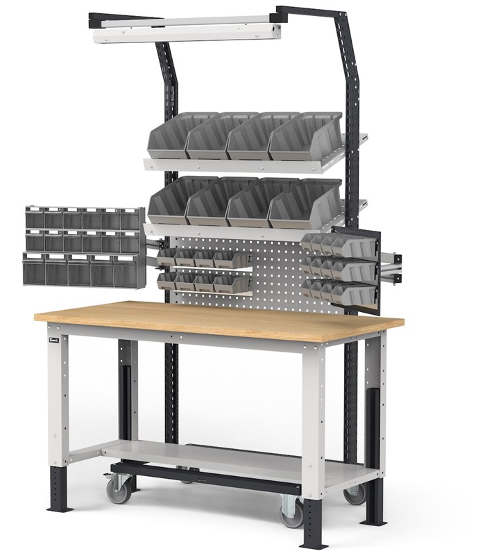 Il carrello lean production è dotato di una grande varietà di materiali per poter creare una postazione di lean production pronta a tutto. Bracci estensibili Ergo Work e mensole consentono l’installazione di contenitori a bocca di lupo e cassettiere trasparenti Visual Box per l’organizzazione ordinata e ragionata di minuteria, viteria e di tutti i kit necessari per l’assemblaggio di prodotti. La parte inferiore del carrello è libera per permettere il posizionamento di un banco da lavoro e disporre di un piano per l’assemblaggio e la lavorazione. Il carrello è completato da una struttura area con lampada, maniglia laterale e ruote in gomma antitraccia sintetica.