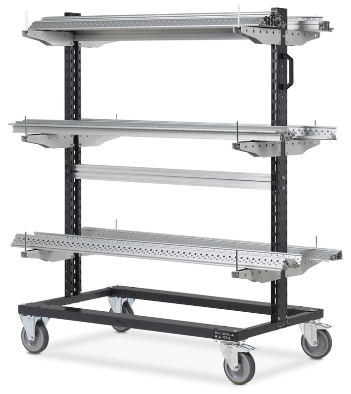 Il carrello rastrelliera Bin Cart consente lo stoccaggio e la movimentazione ordinata e sicura di materiali e componenti particolarmente lunghi. È caratterizzato da coppie di supporti installati a diverse altezze sui montanti su cui è possibile posizionare in completa sicurezza tubi, traverse o pali grazie alla gomma antiscivolo e ai fermi anticaduta frontali. Presenta dei profili in alluminio per irrobustire la struttura e su cui possono essere installati ulteriori elementi come ganci porta cavi. Il carrello è completato da maniglia laterale e da ruote in gomma antitraccia sintetica.