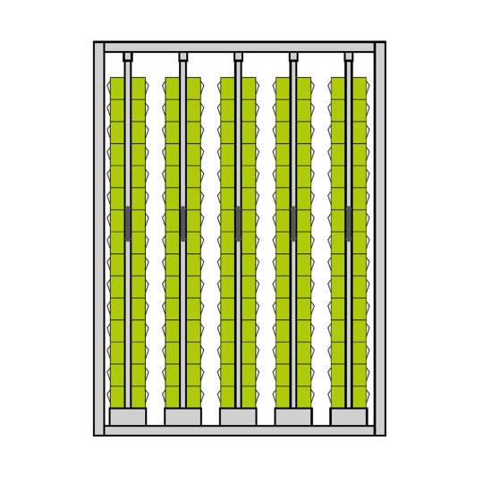 Scaffale a pavimento con 5 telai estraibili, 900 cassette practibox totali.