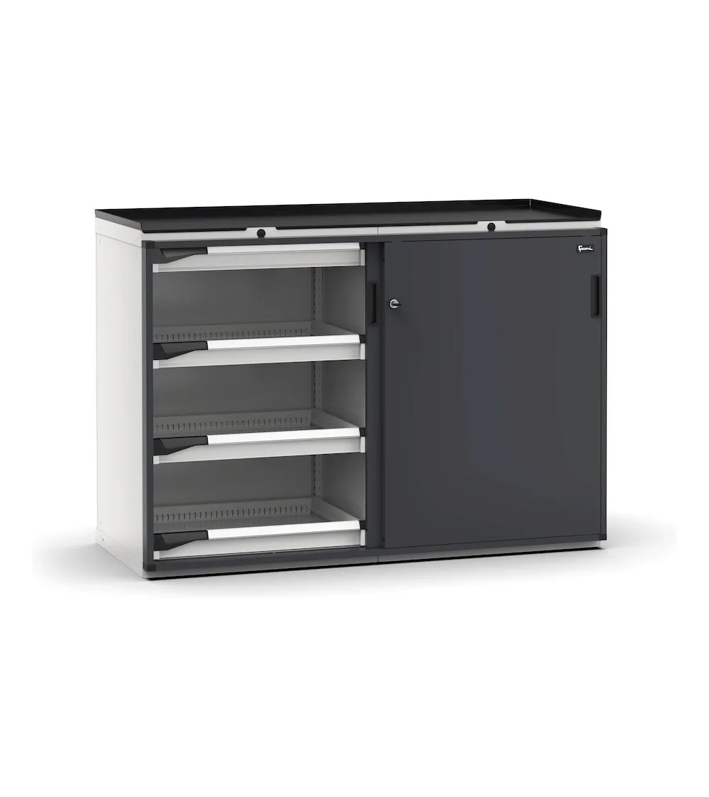 L’armadietto portautensili è dotato di 8 cassetti ad estrazione flessibile e porte scorrevoli con serratura a cilindro. La dimensione compatta e l’apertura scorrevole consentono di posizionarlo in ambienti stretti o di passaggio così da disporre di una soluzione di stoccaggio non ingombrante. Il piano superiore è ricoperto da una top a 3 bordi in PVC per proteggerlo da sporcizia e poterlo utilizzare come piano di lavoro. I cassetti possono essere allestiti internamente con materiale di separazione o con i vassoi portautensili Pikpad.