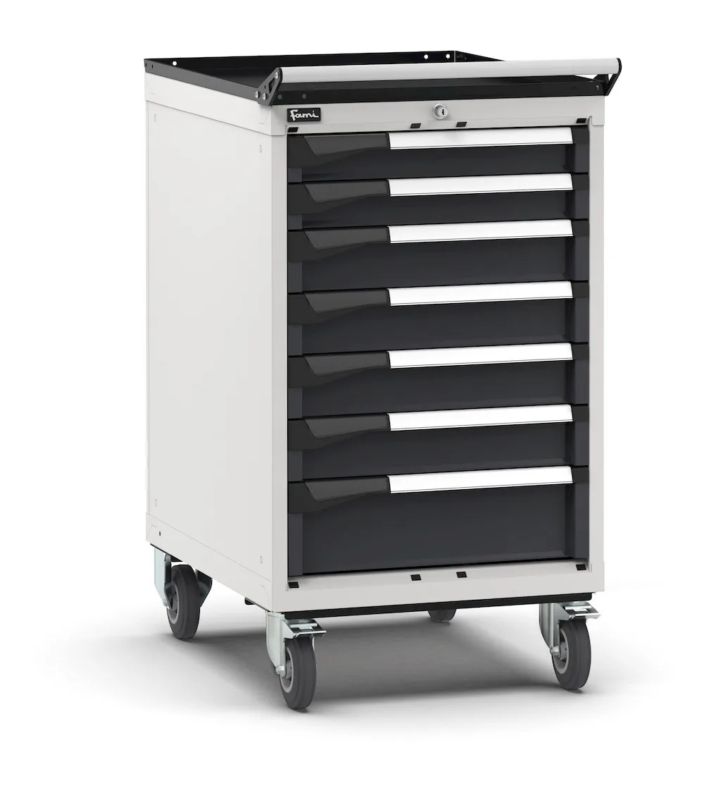 La cassettiera porta attrezzi con ruote è uno strumento versatile e funzionale per l’organizzazione e la movimentazione del materiale di lavoro. Utensili e componenti sono custoditi al sicuro e in ordine grazie alla serratura a cilindro con chiave e ai 7 cassetti ad estrazione flessibile. Quest’ultimi possono essere suddivisi internamente tramite divisori in metallo e cassette contenitori, o, in alternativa, possono ospitare i Pikpad, vassoi portautensili mobili. Le ruote in gomma elastica e la maniglia completano il carrello per agevolarne lo spostamento all’interno dell’azienda.