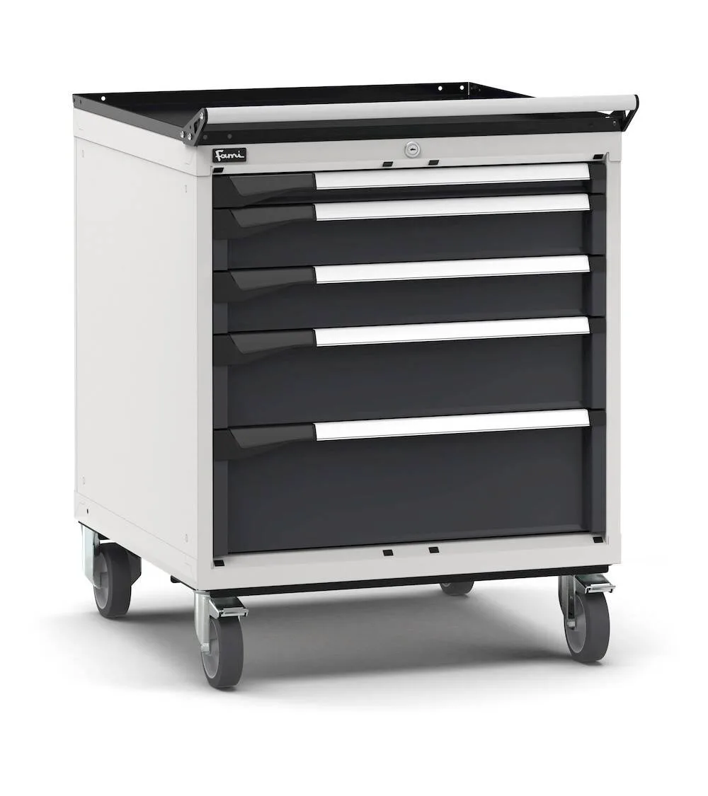 La cassettiera porta attrezzi con ruote è la soluzione ideale per disporre di una postazione mobile per attività di manutenzione o riparazione. Grazie a ruote in gomma elastica e maniglia può essere spostata all’interno dell’azienda per avere a disposizione utensili e componenti custoditi in sicurezza nei 5 cassetti ad estrazione flessibile. L’interno di ogni cassetto è organizzabile tramite i diversi materiali di separazione come divisori in metallo o cassette divisorio. In alternativa è possibile utilizzare i vassoi porta utensili Pikpad. La serratura centrale è a cilindro con chiave.