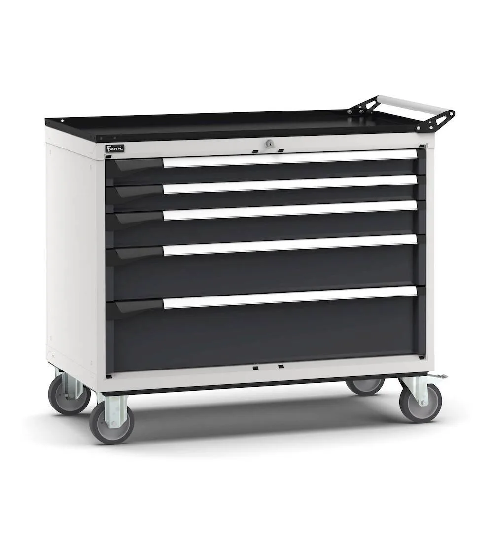 La cassettiera porta attrezzi con ruote è la soluzione ideale per disporre di una postazione mobile per attività di manutenzione o riparazione. Grazie a ruote in gomma elastica e maniglia può essere spostata all’interno dell’azienda per avere a disposizione utensili e componenti custoditi in sicurezza nei 5 cassetti ad estrazione flessibile. L’interno di ogni cassetto è organizzabile tramite i diversi materiali di separazione come divisori in metallo o cassette divisorio. In alternativa è possibile utilizzare i vassoi porta utensili Pikpad. La serratura centrale è a cilindro con chiave.