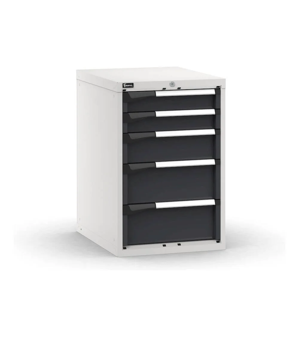 Il blocco cassettiera da banco può essere installato in un banco da lavoro oppure utilizzato come pratica cassettiera portautensili in officina o reparto. Ha 5 cassetti ad estrazione flessibile di varie altezze caratterizzati da fondo forato e lati scanalati per l’installazione di divisori e cassette contenitore. L’interno del cassetto può essere anche allestito utilizzato i vassoi portautensili Pikpad. La sicurezza è garantita dalla serratura a cilindro con chiave che blocca l’apertura di tutti i cassetti ed evita l’accesso al personale non autorizzato.