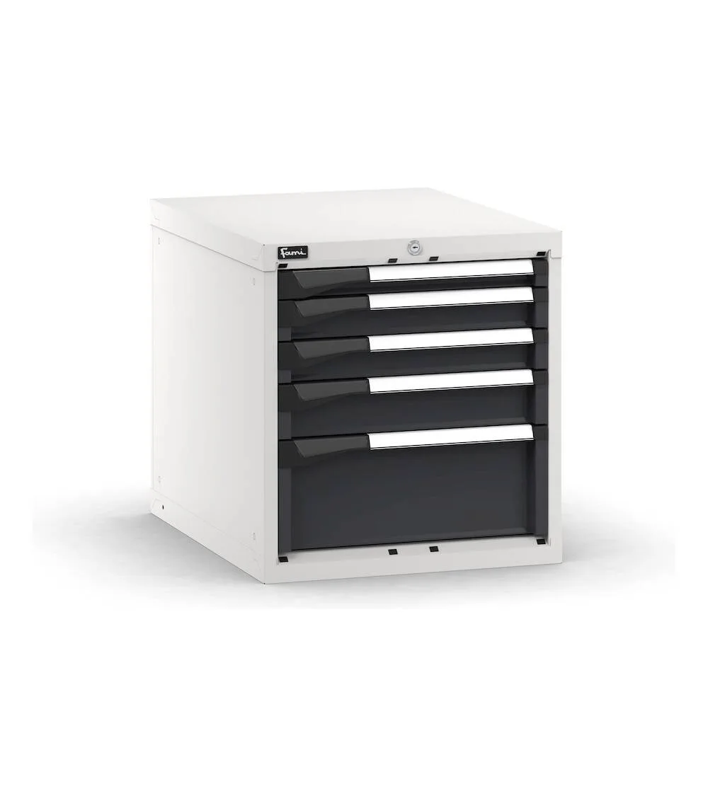 Il blocco cassettiera da banco può essere installato in un banco da lavoro oppure utilizzato come pratica cassettiera portautensili in officina o reparto. Ha 5 cassetti ad estrazione flessibile di varie altezze caratterizzati da fondo forato e lati scanalati per l’installazione di divisori e cassette contenitore. L’interno del cassetto può essere anche allestito utilizzato i vassoi portautensili Pikpad. La sicurezza è garantita dalla serratura a cilindro con chiave che blocca l’apertura di tutti i cassetti ed evita l’accesso al personale non autorizzato.