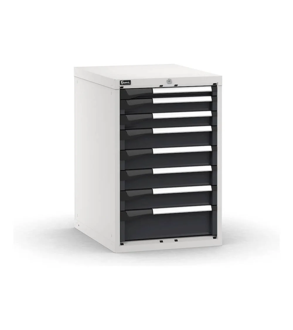 Il blocco cassettiera da banco è dotato di 8 cassetti ad estrazione flessibile e di una serratura a cilindro con chiave per la custodia ordinata e sicura di attrezzatura, utensili e minuteria. I cassetti hanno altezze frontali differenti e possono essere allestiti con divisori in metallo, vaschette contenitore oppure tramite i pratici Pikpad, vassoi portautensili configurabili e movimentabili. La cassettiera può essere utilizzata come complemento di un banco oppure come soluzione portautensili accanto a macchinari o in officina.