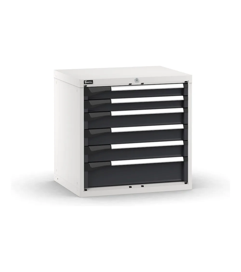 Il blocco cassettiera da banco presenta 6 cassetti ad estrazione flessibile e una serratura a cilindro con chiave. I cassetti di altezze differenti permettono la custodia organizzata di una grande varietà di attrezzatura tramite l’uso di cassette divisorio o divisori in metallo. Una pratica alternativa a questi materiali di separazione sono i Pikpad, vassoi portautensili movimentabili e liberamente organizzabili. Il blocco cassettiera è installabile in banchi da lavoro o utilizzabile singolarmente per rendere ancora più funzionale un reparto o un’officina.