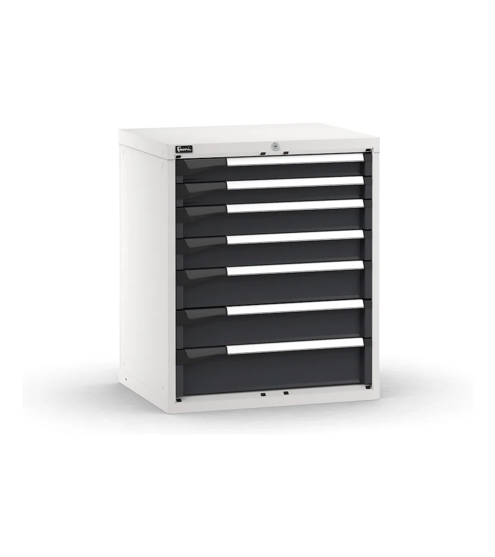 Il blocco cassettiera da banco con 7 cassetti ad estrazione flessibile può essere utilizzato singolarmente come portautensili in officina o reparto oppure può essere installato nei banchi da lavoro. Utensili, attrezzi e ricambi possono essere inseriti in ordine all’interno dei cassetti con altezze diverse grazie all’uso di cassette portaminuteria o divisori in metallo. Un ulteriore soluzione di organizzazione sono i Pikpad, vassoi portautensili. La serratura a cilindro con chiave garantisce la custodia sicura del materiale stoccato.