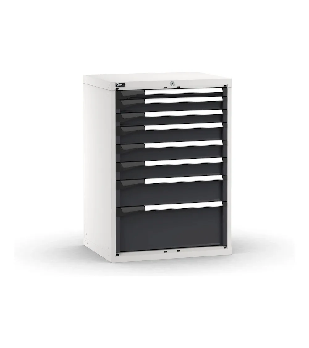 La cassettiera porta attrezzi è allestita con 8 cassetti ad estrazione flessibile che presentano altezze frontali differenti per facilitare lo stoccaggio di una vasta gamma di materiale per il lavoro. È dotata di serratura a cilindro centrale e il piano superiore può essere arricchito con numerose tipologie di top per il lavoro. L’interno di ogni cassetto è liberamente configurabile tramite l’installazione di divisori in metallo o cassette contenitore. In alternativa, è possibile inserire i vassoi portautensili mobili Pikpad.