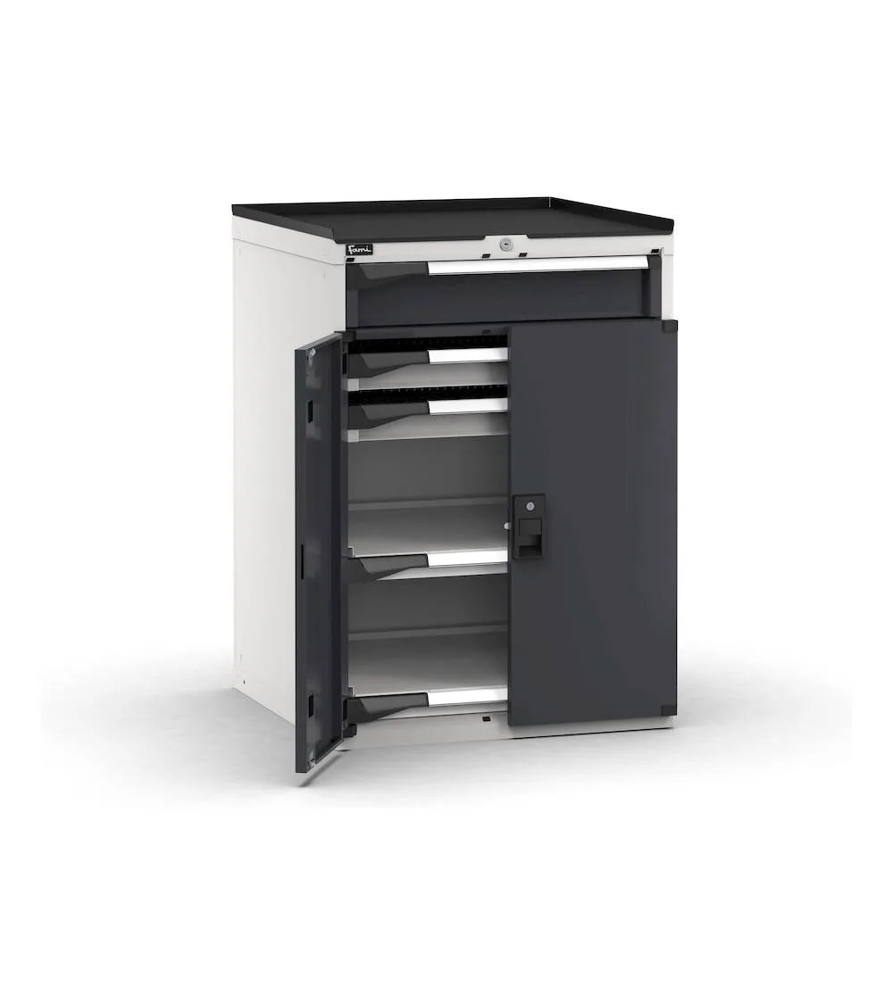 L’armadietto portautensili può essere impiegato sia come soluzione di stoccaggio, grazie a 3 cassetti e a 2 piani, entrambi ad estrazione telescopica, sia come postazione di lavoro. Il piano di lavoro a 3 bordi in PVC, infatti, protegge l’armadio e permette di effettuare numerose lavorazioni e operazioni. Lo spazio interno del cassetto può essere organizzato tramite materiale di separazione o vassoi portautensili Pikpad. Le porte presentano serratura a cilindro e apertura a battente.