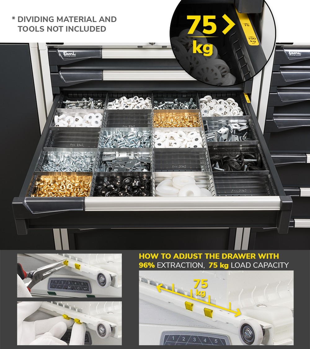 Il blocco cassettiera da banco con 7 cassetti ad estrazione telescopica può essere utilizzato singolarmente come portautensili in officina o reparto oppure può essere installato nei banchi da lavoro. Utensili, attrezzi e ricambi possono essere inseriti in ordine all’interno dei cassetti con altezze diverse grazie all’uso di cassette portaminuteria o divisori in metallo. Un ulteriore soluzione di organizzazione sono i Pikpad, vassoi portautensili. La serratura a cilindro con chiave garantisce la custodia sicura del materiale stoccato.