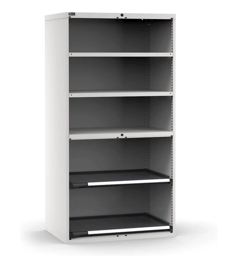 L’armadio portautensili a ripiani facilita l’organizzazione e lo stoccaggio di attrezzatura, ricambi e componenti di varie dimensioni e volumi. Presenta 2 ripiani ad estrazione telescopica nella parte inferiore e 2 ripiani fessurati regolabili in altezza nella parte superiore. Il piano intermedio rende l’intera struttura stabile e robusta.