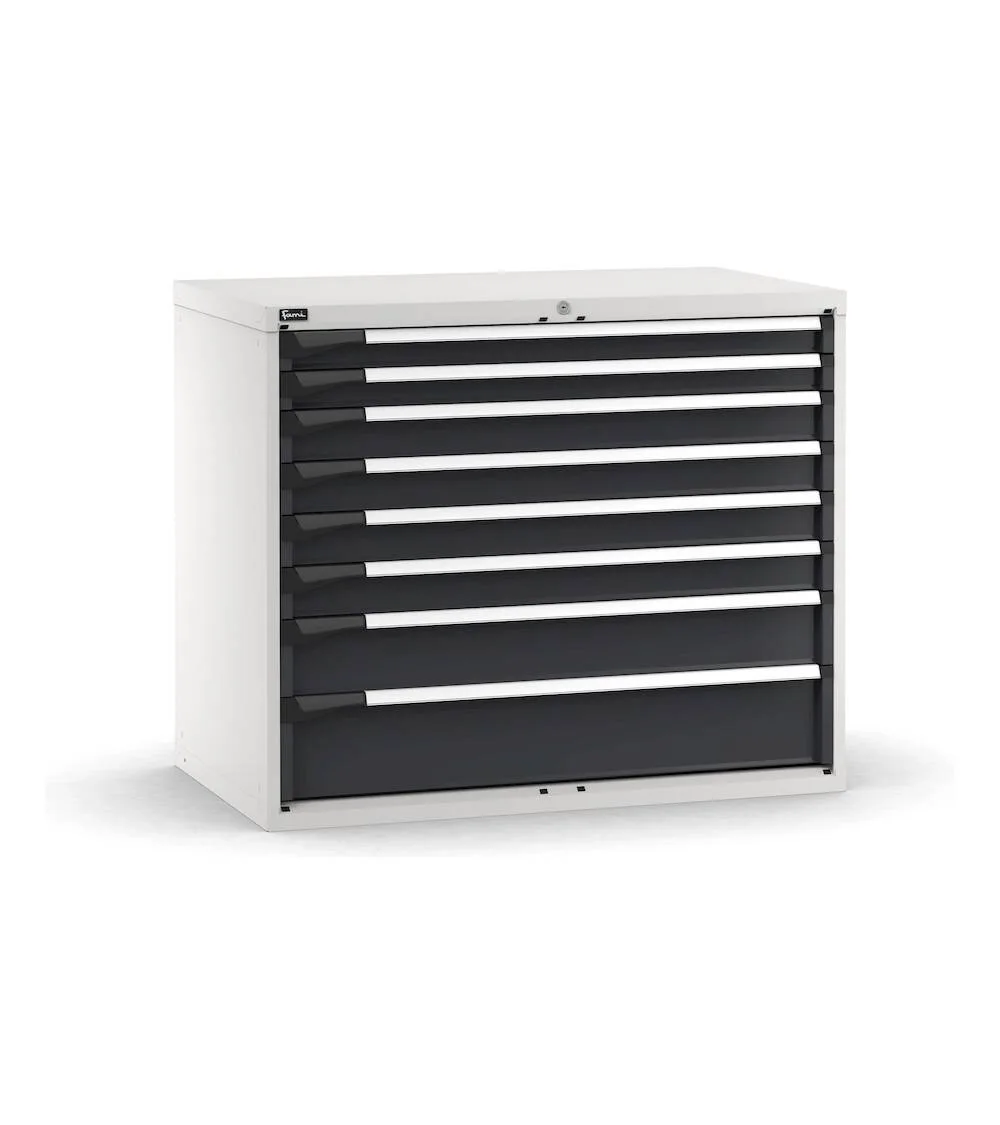 La cassettiera porta attrezzi è allestita con 8 cassetti ad estrazione flessibile che presentano altezze frontali differenti per facilitare lo stoccaggio di una vasta gamma di materiale per il lavoro. È dotata di serratura a cilindro centrale e il piano superiore può essere arricchito con numerose tipologie di top per il lavoro. L’interno di ogni cassetto è liberamente configurabile tramite l’installazione di divisori in metallo o cassette contenitore. In alternativa, è possibile inserire i vassoi portautensili mobili Pikpad.