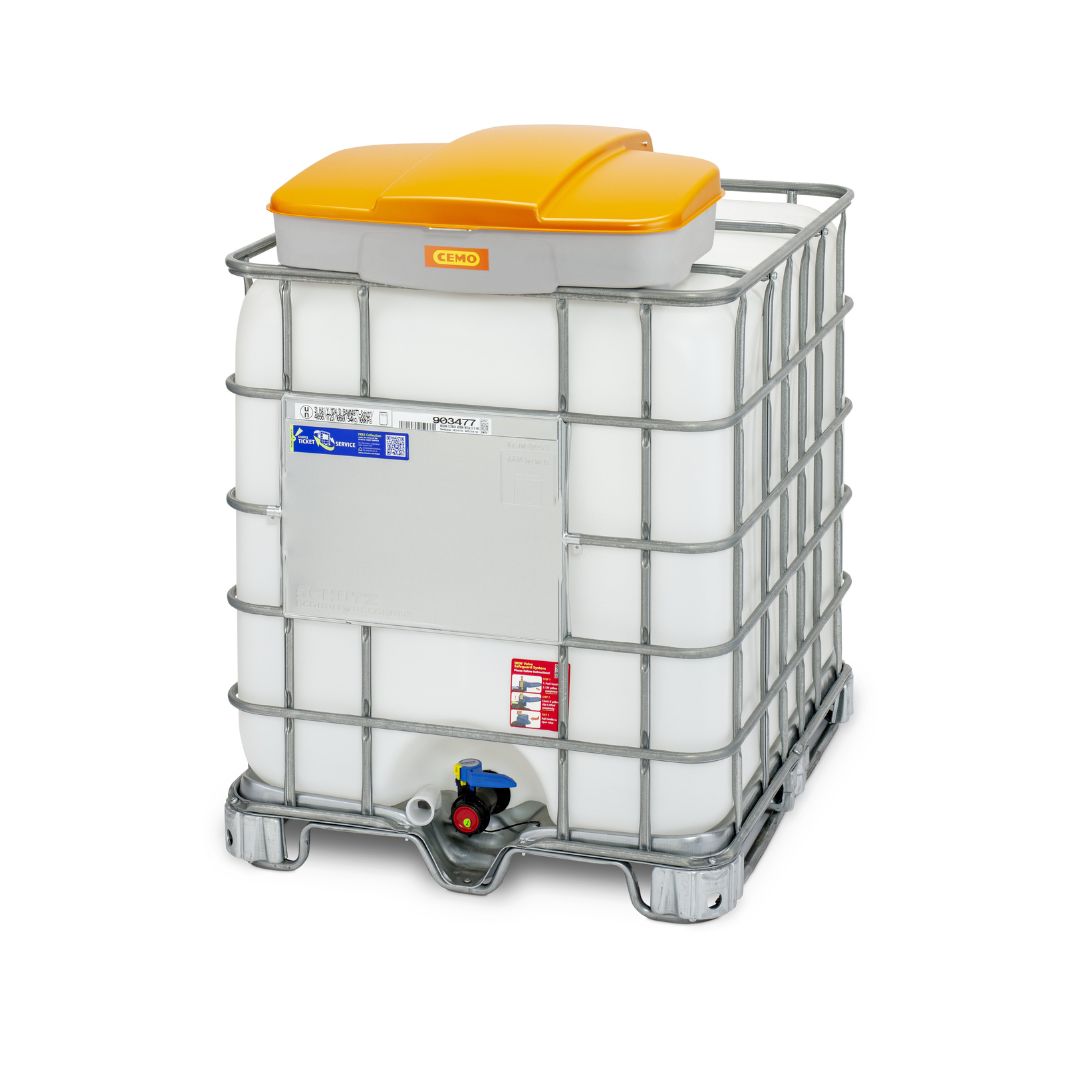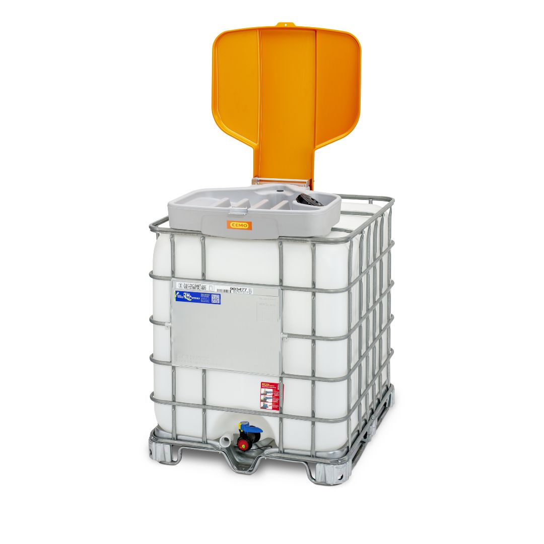 Imbuto per Riempimento Cisterne IBC da 1000 L con coperchio incernierato, realizzato in PE altamente resistente, resistente agli acidi, sostanze chimiche e oli.