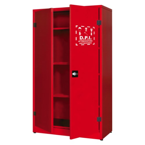 Gli armadi antincendio di Ricomi sono realizzati in lamiera di acciaio spessore 10/10, pre-trattato con fosfosgrassaggio, verniciatura a in epossipoliestere colore rosso RAL3000 e cottura in galleria termica 180°. Gli armadi DPI sono dotati di ripiani regolabili in altezza, spigoli arrotondati, piedini regolabili, ante a battente con robuste cerniere e maglia ergonomica in plastica e alluminio con doppia chiave completa di chiusura ad asta con carter copri aste antimanomissione.