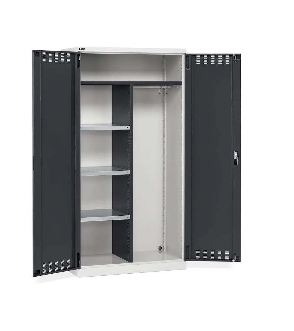 L’armadio con ante a battente fessurate e parete divisorio Perfom consente di avere a disposizione diverse modalità di stoccaggio, così da poter inserire prodotti di tipologie diverse. La parete divisorio suddivide l’armadio in due aree: la prima ripartita in vani di dimensioni minori tramite piani fessurati, la seconda con un tubo appendiabiti per l’inserimento di indumenti e tute.