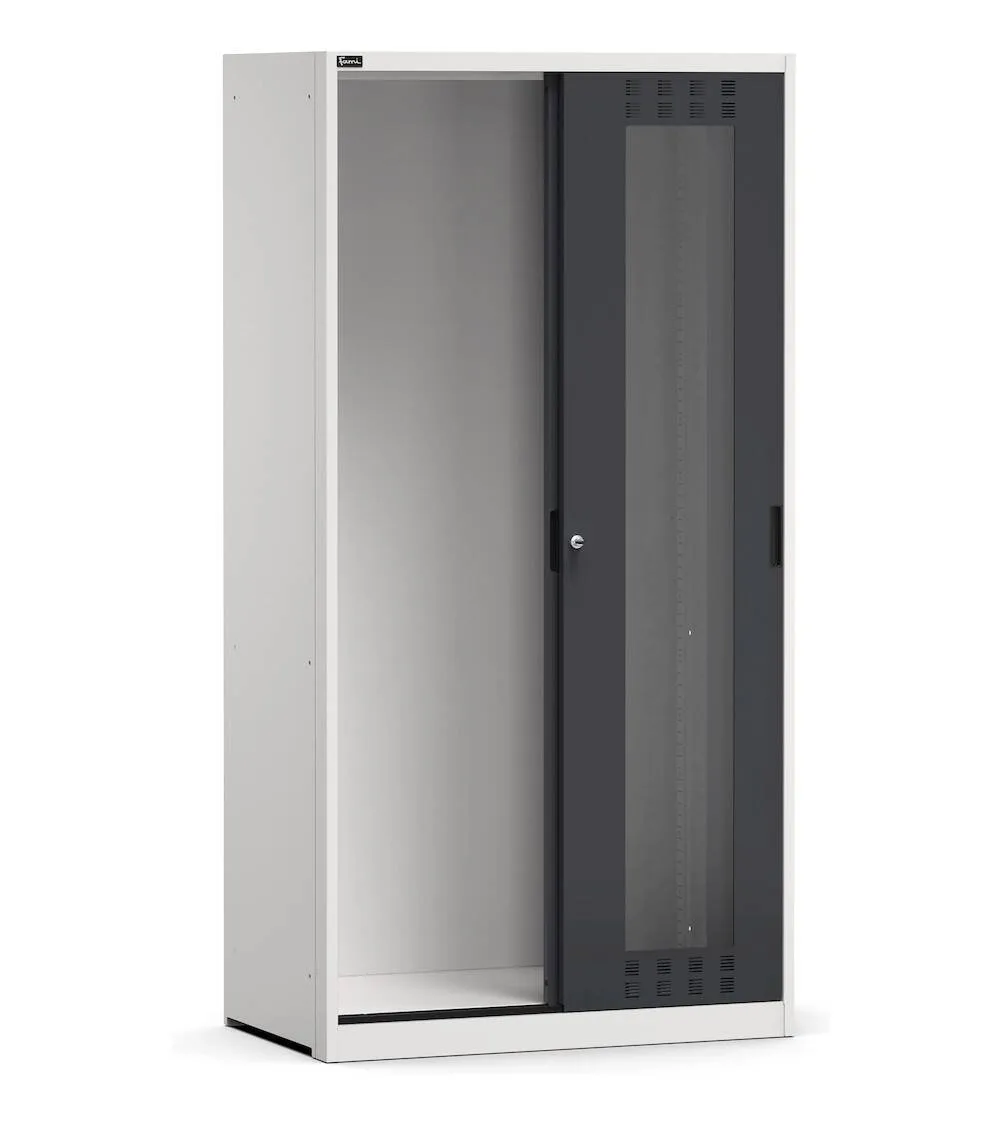 L’armadio vuoto con porte scorrevoli fessurate presenta degli inserti in policarbonato per consentire una visualizzazione immediata di tutto il contenuto. Può essere allestito facilmente con numerosi componenti per declinarlo in base alla tipologia di materiale da stoccare.