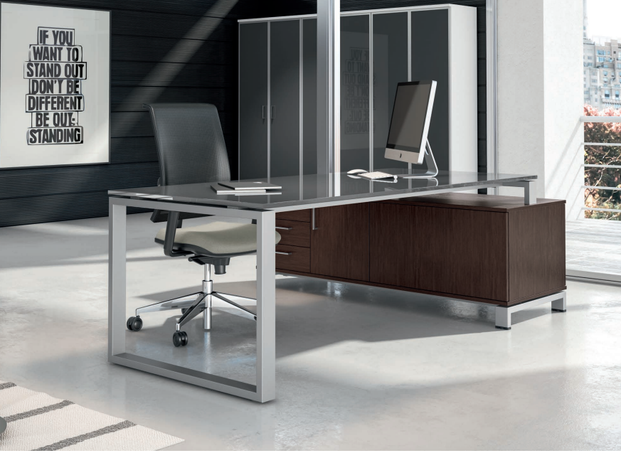 Piano scrivania in vetro serigrafato di colore grigio con spessore 12 mm.. La gamba in lamiera con profilato 70×30 mm ad anello oppure ad “U”. La trave da 80 a 200 cm in lamiera piegata 30×30 mm. Sulle travi è possibile agganciare il passacavi per il cablaggio della scrivania.