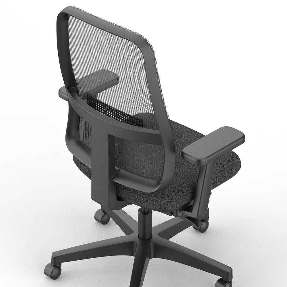 Poltrona Fresh girevole con braccioli regolabili, seduta imbottita con poliuretano espanso di altissima densità e rivestimento in tessuto, schienale in rete.