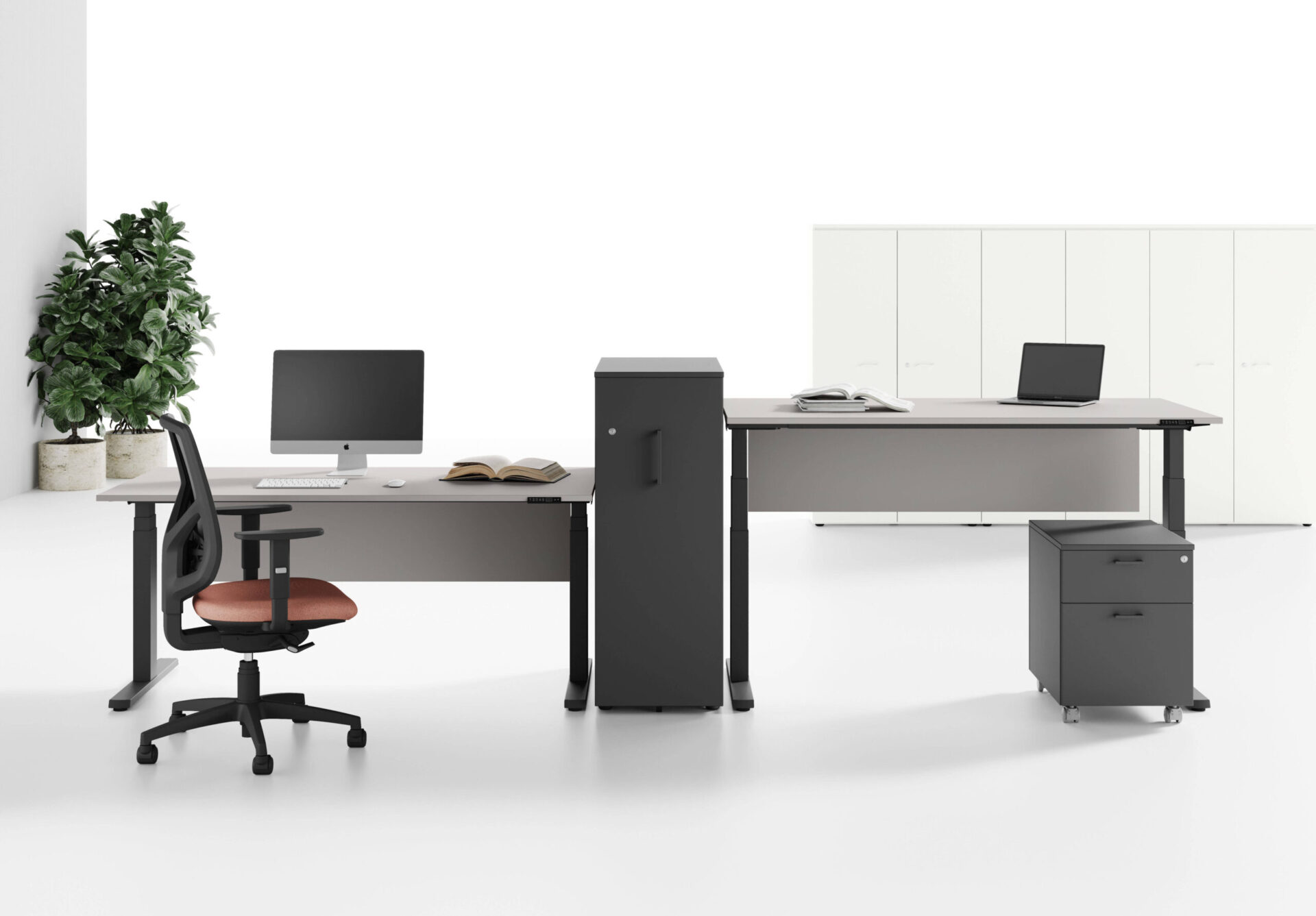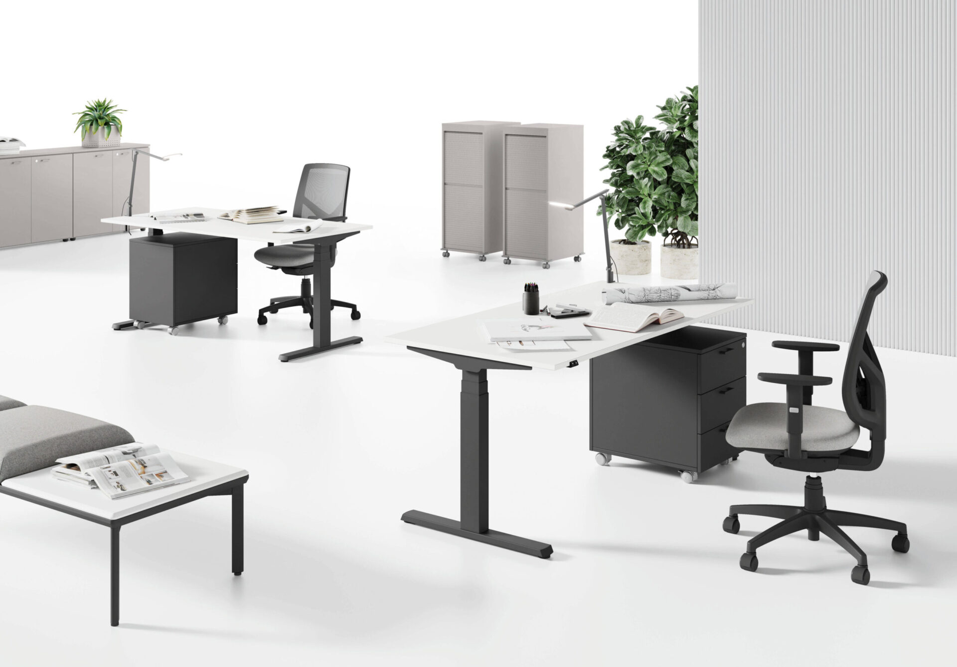 Le postazioni con piano regolabile in altezza garantiscono ergonomia e funzionalità, permettendo di variare la postura durante il giorno e di lavorare in piedi o seduti. La versione singola, compatta e versatile, soddisfa esigenze di layout ad elevata variabilità.