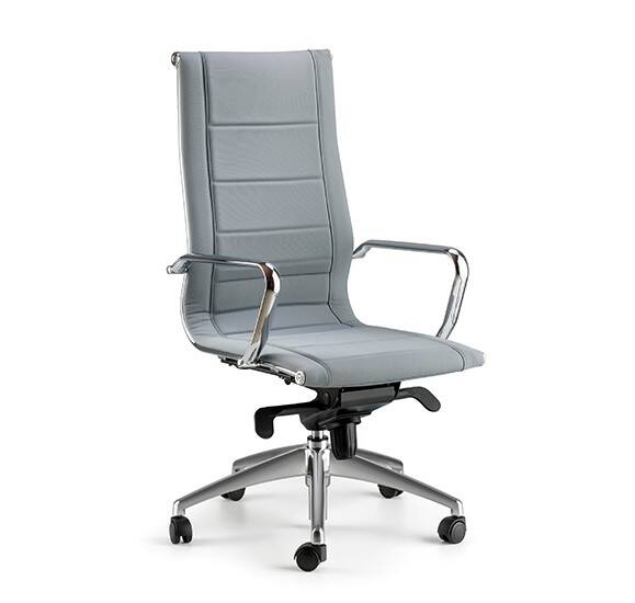 Poltrona direzionale Kira con schienale alto, in ecopelle con braccioli in alluminio lucido e razze cromate ed oscillante.