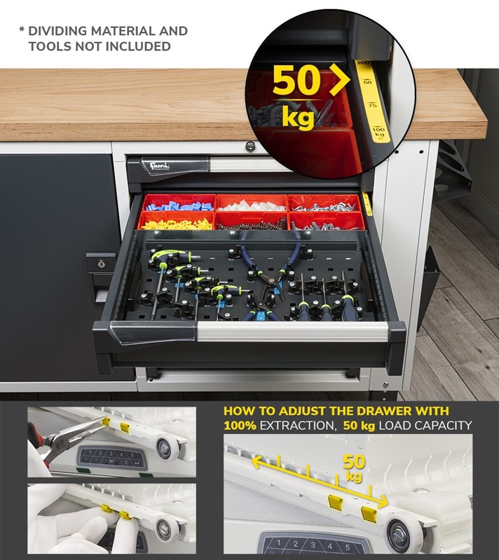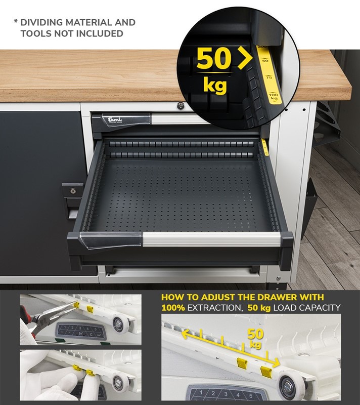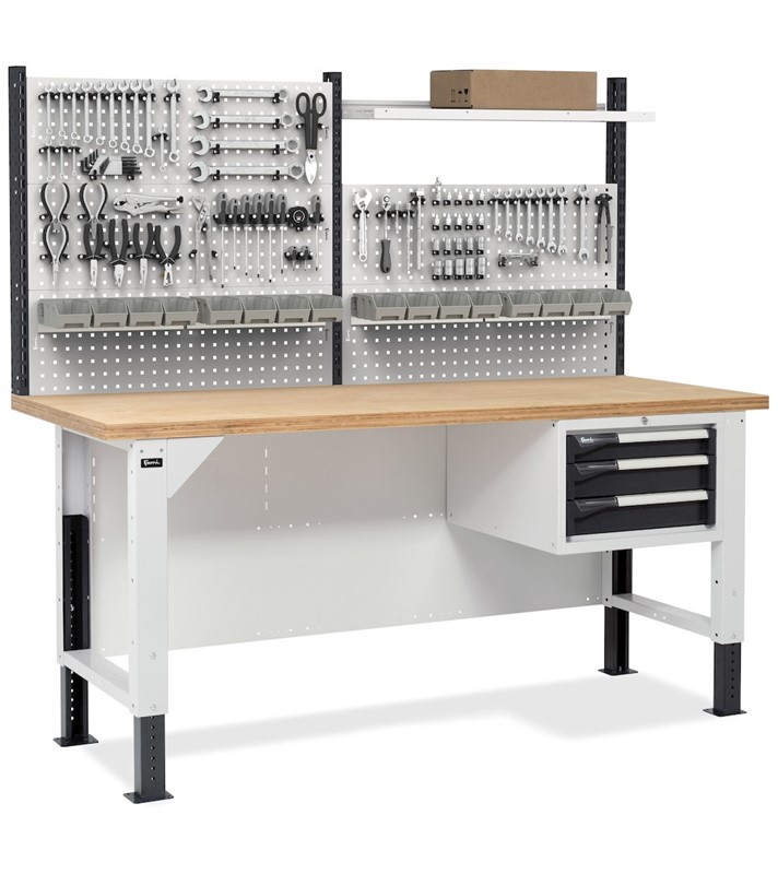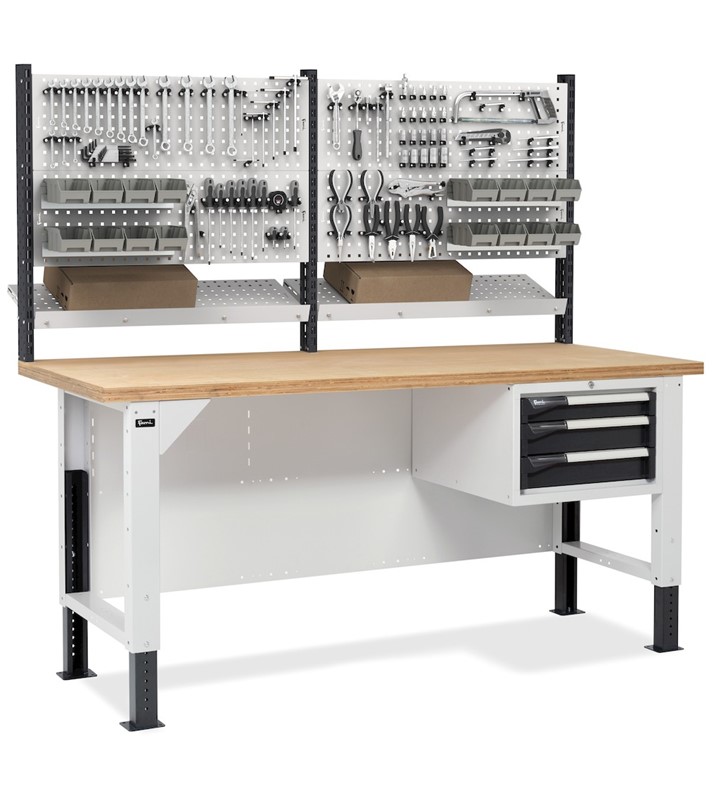 Il banco da lavoro portautensili Work Master BR è regolabile in altezza e presenta un piano di lavoro in multiplex di spessore 40 mm e un armadio con 3 cassetti ad estrazione e portata modificabile liberamente. L’attrezzatura di lavoro può essere custodita sia nei cassetti che nel pannello forato installato nella parte superiore.