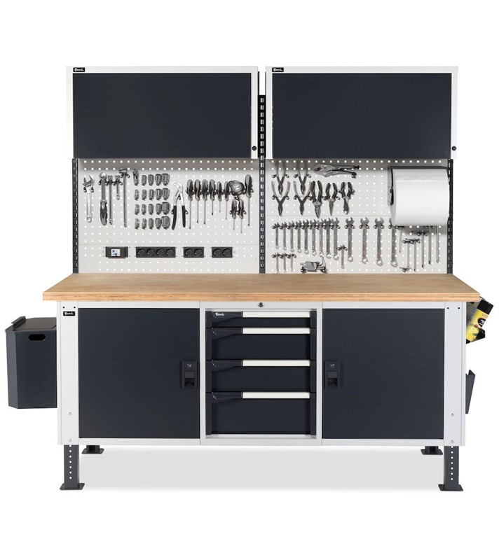 Il banco da lavoro attrezzato è dotato di 4 cassetti, 2 armadietti e pensili, ideali per riporre e organizzare gli strumenti di lavoro. I cassetti sono resistenti e scorrono su guide a sfera, mentre gli armadietti e i pensili sono dotati di serrature per proteggere gli oggetti contenuti.