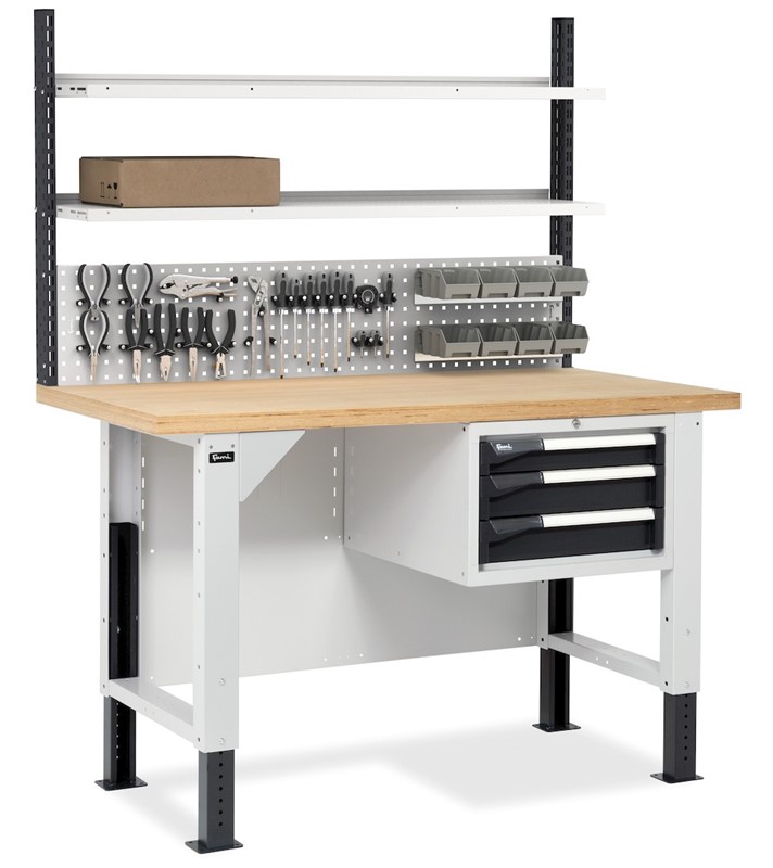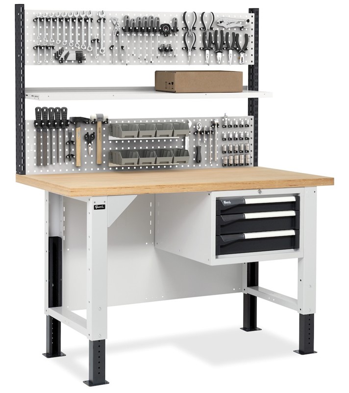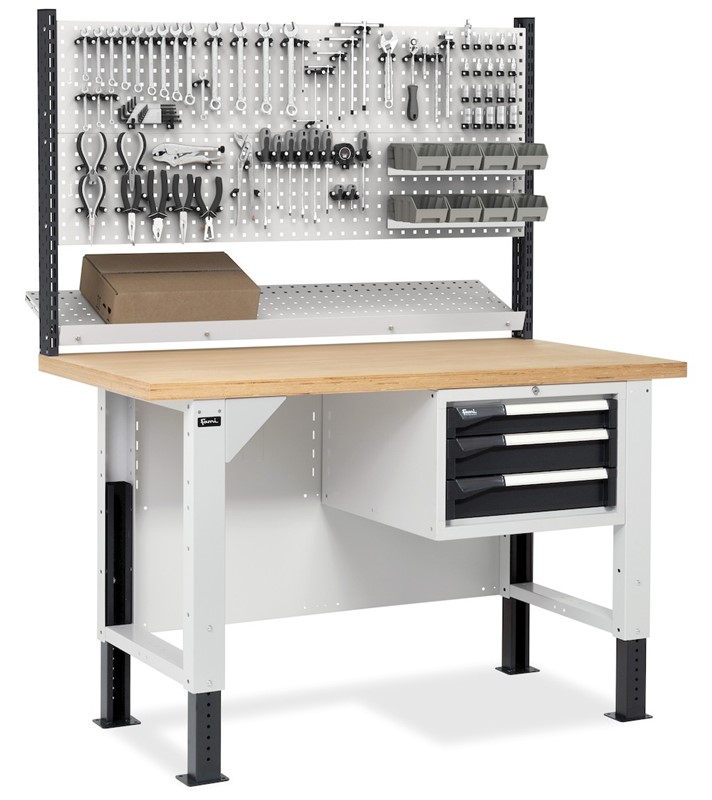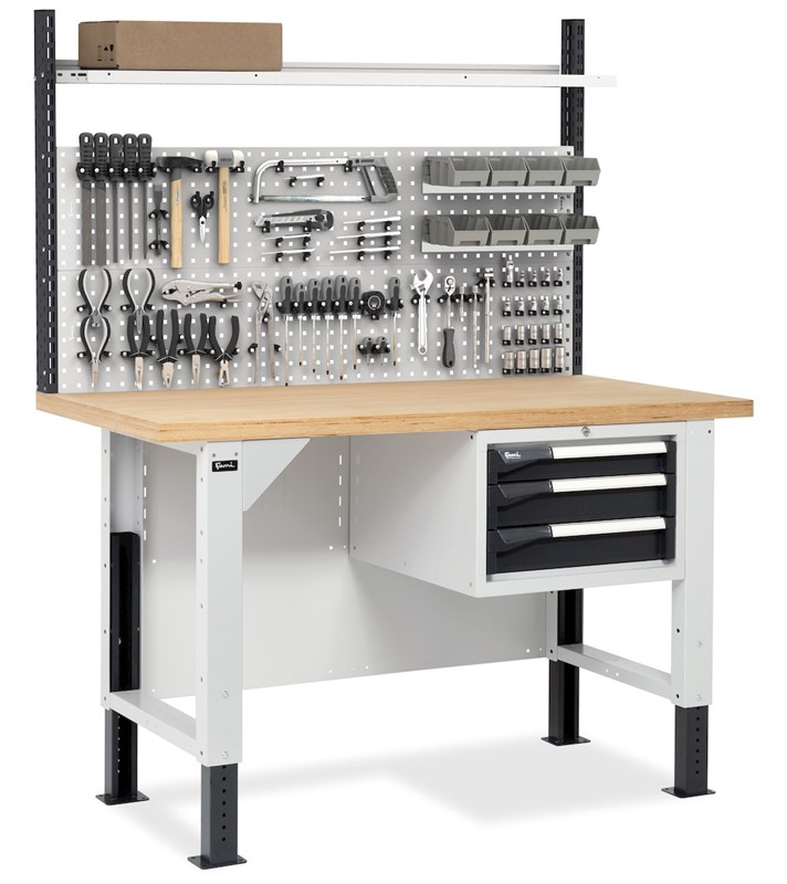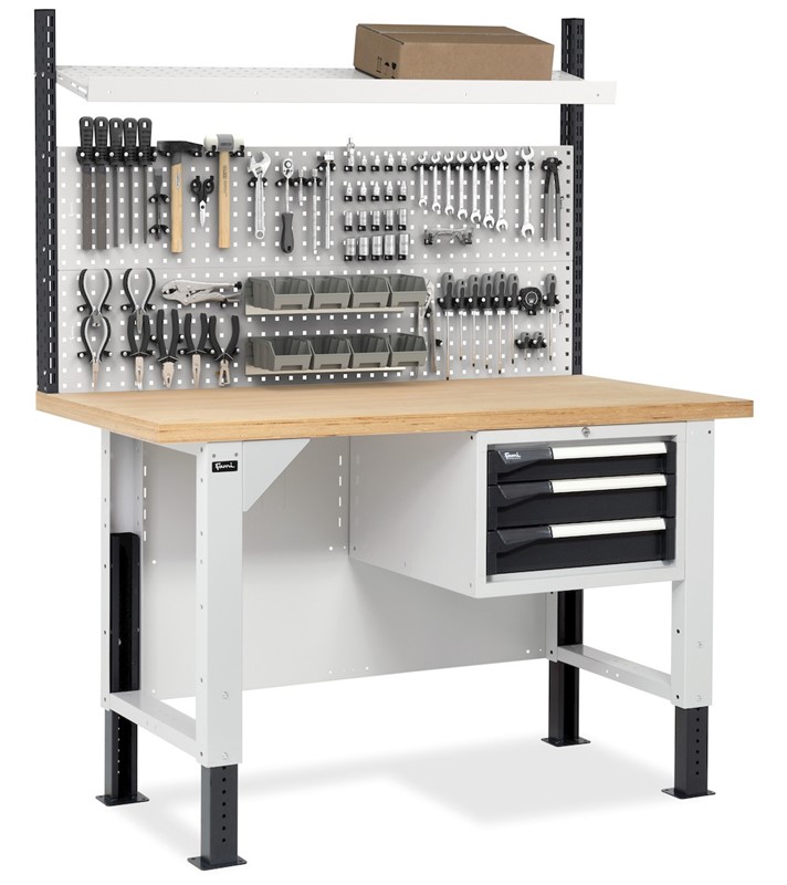 Il banco da lavoro portautensili Work Master BR è regolabile in altezza e presenta un piano di lavoro in multiplex di spessore 40 mm e un armadio con 3 cassetti ad estrazione e portata modificabile liberamente. L’attrezzatura di lavoro può essere custodita sia nei cassetti che nel pannello forato installato nella parte superiore.