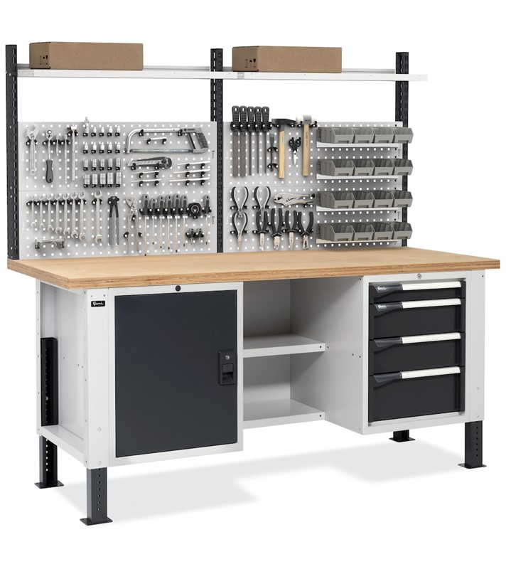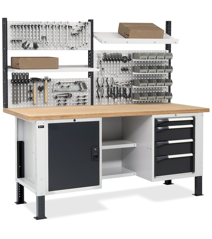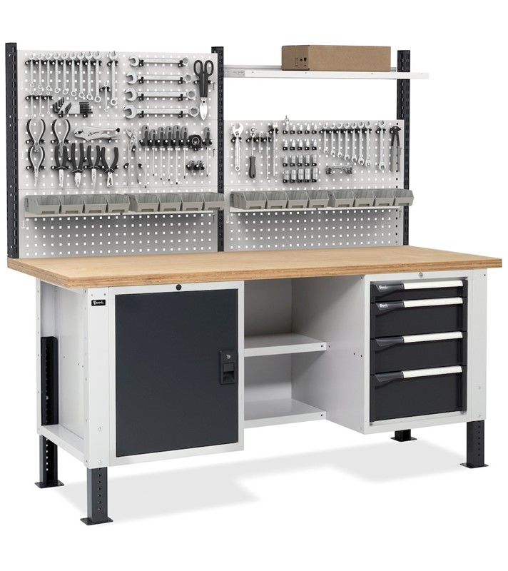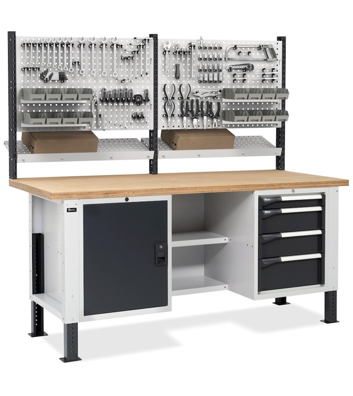Il banco da lavoro regolabile in altezza Work Master BR è un pratico alleato per il lavoro grazie al robusto piano in multiplex da 40 mm ideale per effettuare numerose operazioni. Il materiale e gli utensili possono essere organizzati nell’armadio con 4 cassetti, con portata ed estrazione variabile, nei 2 semipiani oppure nel vano con porta e piano interno.