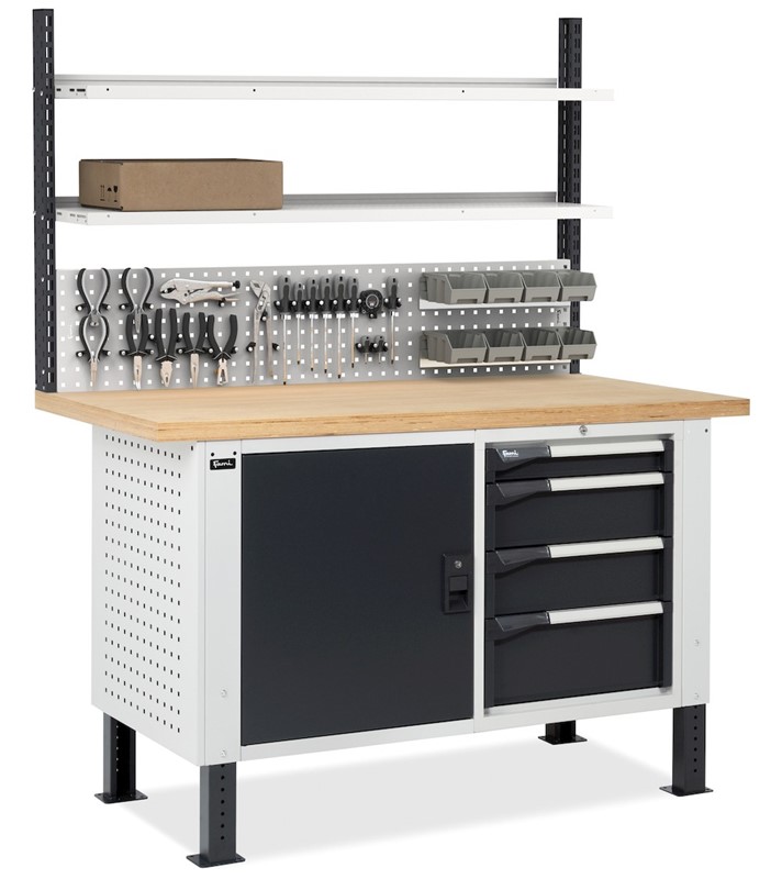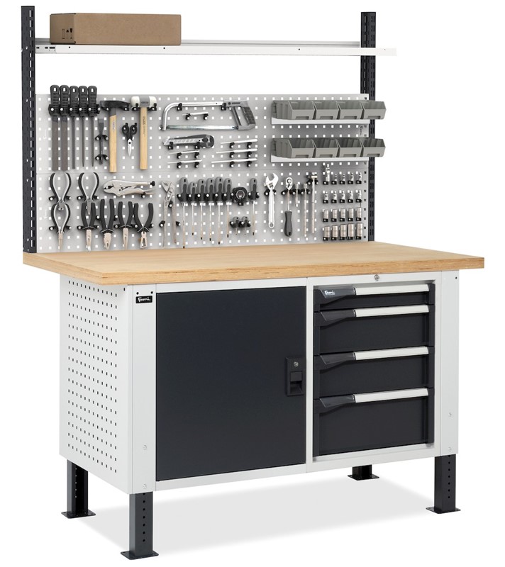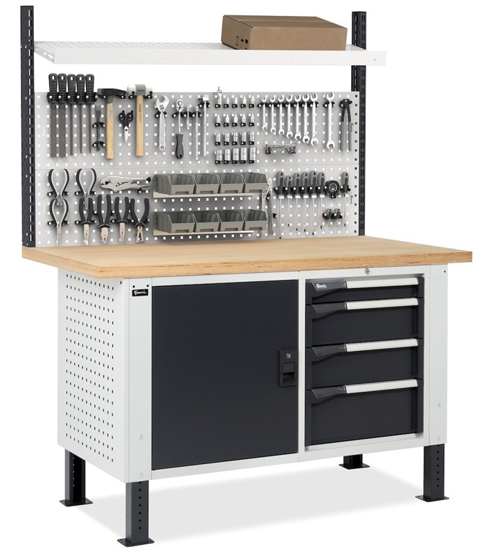 Il banco da lavoro porta attrezzi Work Master BR è dotato di piano in multiplex da 40 mm e gambe regolabili in altezza. Nella parte inferiore è installato un armadio con 4 cassetti, con portata ed estrazione variabile, ed un vano con porta e piano interno. I pannelli forati laterali chiudono i fianchi del banco e consentono il fissaggio di accessori per l’organizzazione di utensili.