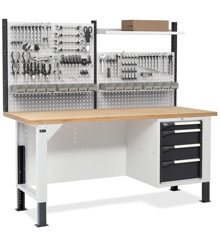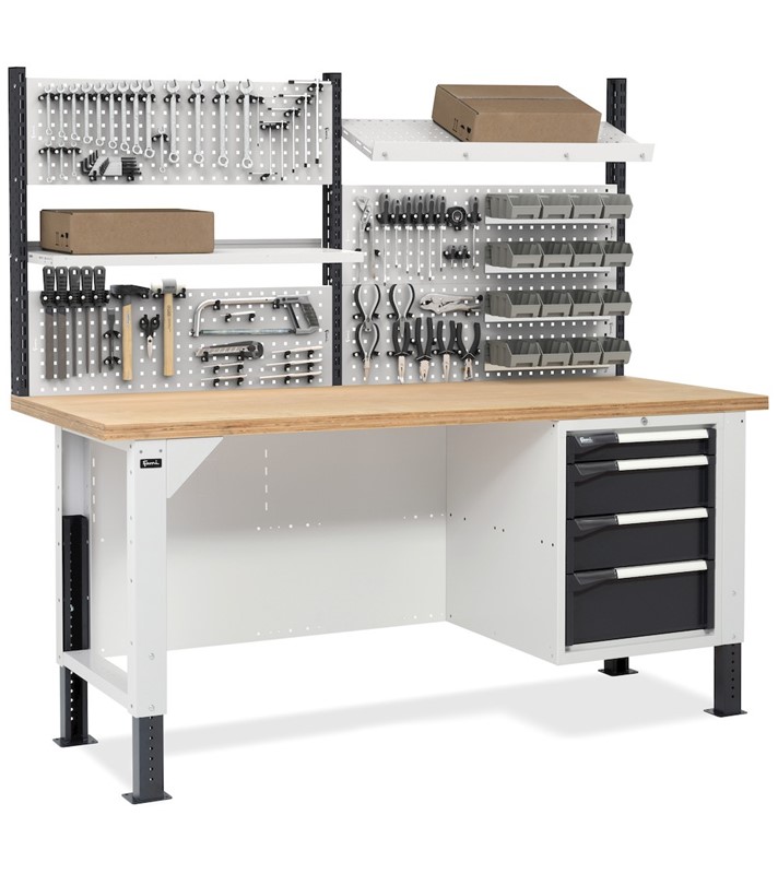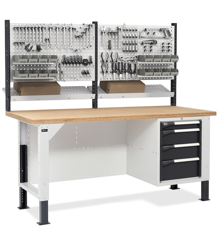 Il banco da lavoro portautensili Work Master BR è regolabile in altezza e presenta un piano di lavoro in multiplex di spessore 40 mm e un armadio con 4 cassetti ad estrazione e portata modificabile liberamente. L’attrezzatura di lavoro può essere custodita sia nei cassetti che nel pannello forato installato nella parte superiore.