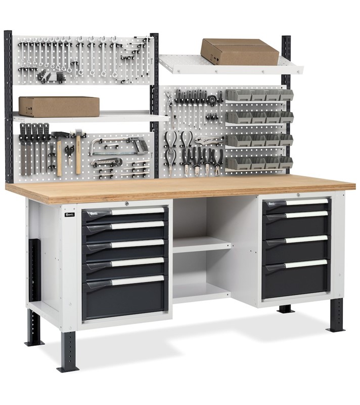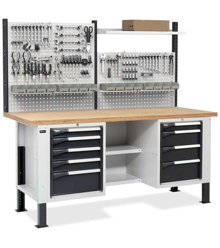 Il banco da lavoro porta attrezzi Work Master BR è dotato di gambe regolabili in altezza ed è allestito con due armadi a 4 e 5 cassetti, con estrazione e portata variabile, e 2 semipiani. Il piano di lavoro è in multiplex con spessore 40 mm e presenta, inoltre, chiusura posteriore e due pannelli forati laterali per il fissaggio di accessori e ganci.