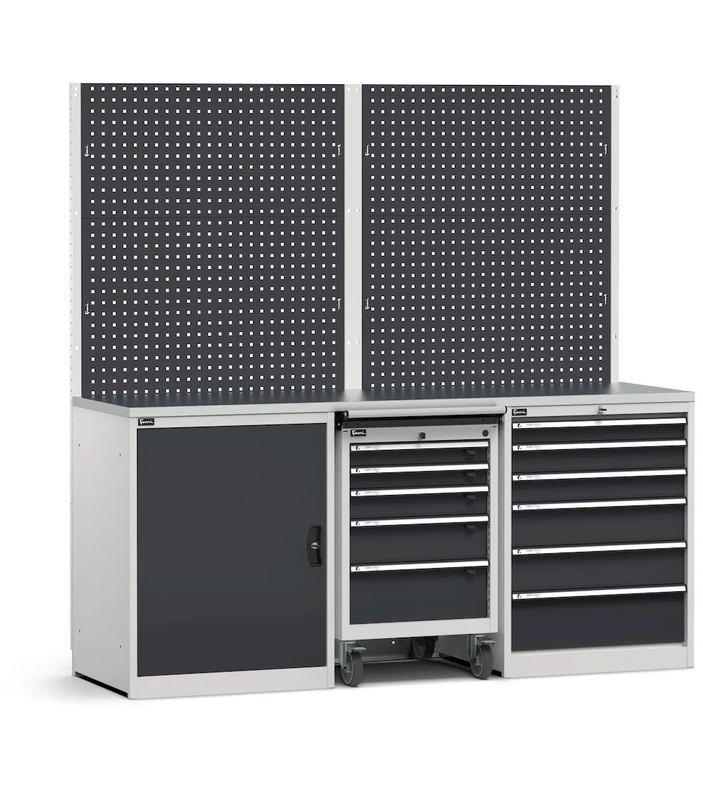Questa composizione è un ottima base per costruire una postazione di lavoro per officina organizzata e accessoriata in grado di far fronte a tutte le possibili lavorazioni quotidiane. È costituita da un armadio ad anta a battente, una cassettiera, un carrello con ruote e da una parete attrezzata su cui è possibile posizionare accessori Iron Team, ganci Unipok, oltre a pensili vasistas e prese elettriche. Presenta un piano di lavoro in acciaio inox satinato e può essere facilmente ampliata nel tempo aggiungendo ulteriori moduli, sia angolari che lineari.