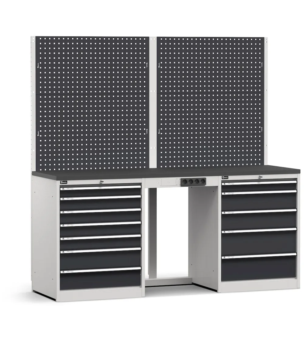 Questa composizione è un ottima base per costruire una postazione di lavoro per officina organizzata e accessoriata in grado di far fronte a tutte le possibili lavorazioni quotidiane. È costituita da due cassettiere, rispettivamente da 7 e da 5 cassetti, e da una parete attrezzata su cui è possibile posizionare accessori Iron Team, ganci Unipok, oltre a pensili vasistas e prese elettriche. Presenta un piano di lavoro in acciaio e può essere facilmente ampliata nel tempo aggiungendo ulteriori moduli, sia angolari che lineari.