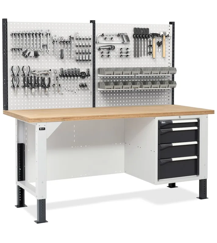 Il banco da lavoro portautensili Work Master BR è regolabile in altezza e presenta un piano di lavoro in multiplex di spessore 40 mm e un armadio con 4 cassetti ad estrazione e portata modificabile liberamente. L’attrezzatura di lavoro può essere custodita sia nei cassetti che nel pannello forato installato nella parte superiore.