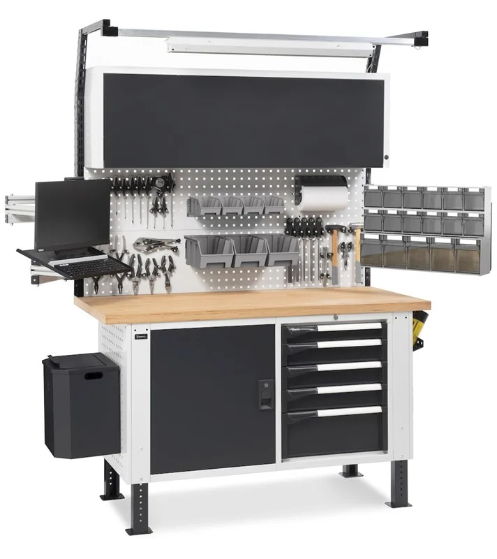 Il banco da lavoro con pannello portautensili Work Master BR è allestito con numerose soluzioni che aumentano lo spazio per lo stoccaggio e rendono più organizzata la postazione di lavoro. Oltre ai tradizionali armadi con porta e con cassetti, il banco presenta un pensile vasistas e tre Ergo Work, i bracci estensibili per il supporto di monitor, vassoio inclinato e Visual Box. Ganci universali Unipok e accessori Iron Team sono installati sulla parete attrezzata e sui pannelli laterali forati per la custodia di attrezzatura e utensili. L’illuminazione del piano di lavoro è garantita dalla lampada LED doppia installata sul binario della struttura aerea.