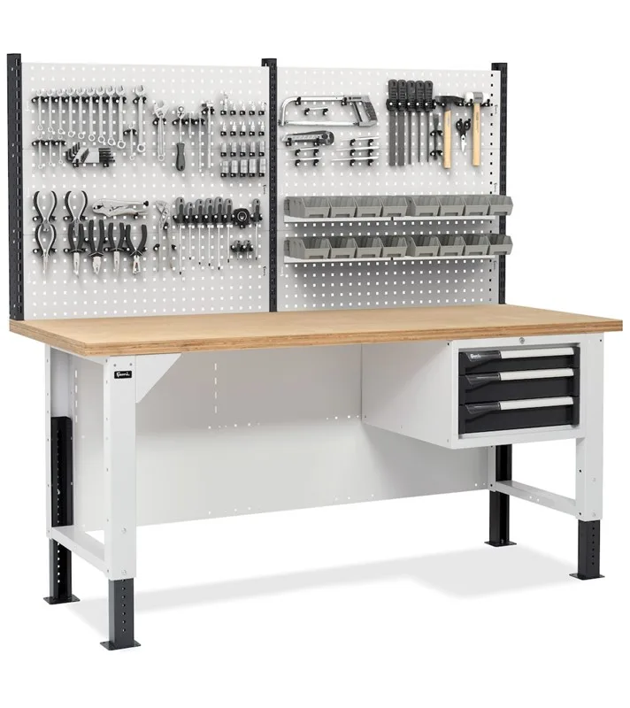 Il banco da lavoro portautensili Work Master BR è regolabile in altezza e presenta un piano di lavoro in multiplex di spessore 40 mm e un armadio con 3 cassetti ad estrazione e portata modificabile liberamente. L’attrezzatura di lavoro può essere custodita sia nei cassetti che nel pannello forato installato nella parte superiore.