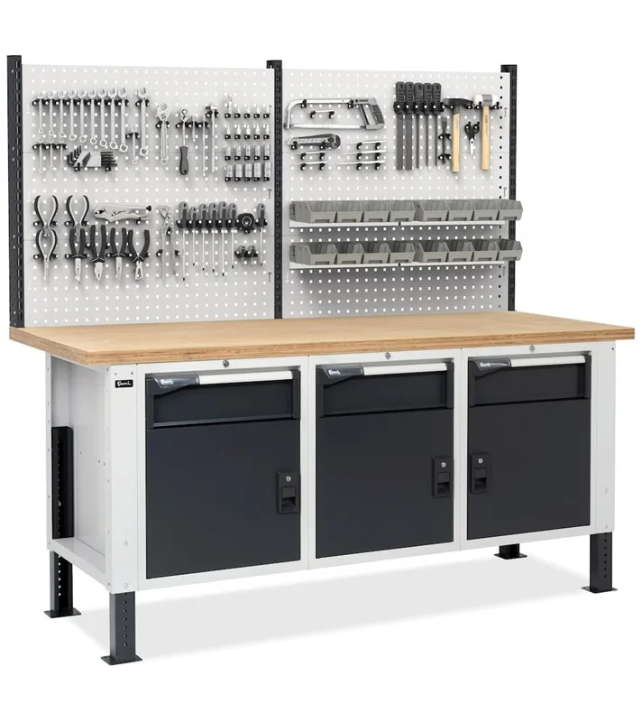 Regolabile in altezza, il banco da lavoro porta attrezzi Work Master BR presenta diversi elementi per rendere la postazione di lavoro efficiente e adatta alle molteplici necessità di utilizzo. Il piano di lavoro è costituito da un piano in multiplex da 40 mm, mentre la parte inferiore è allestita con 3 armadi con un cassetto con portata ed estrazione variabile ed una porta parziale.